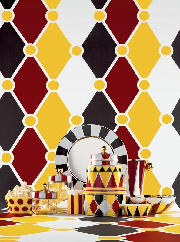 Circus is a playful kitchen and serving collection designed by Marcel Wanders for the Italian design brand Alessi. The collection was inspired by the ambience of old, colourful circus tents, where bright shades of yellow and red combine with strong black and white patterns and the shine of gold and silver. The Circus collection transforms the delightful spirit of old-time circus into a modern shape and fills the table with joyful atmosphere.